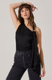 The woman is wearing a black sleeveless top made of shiny satin fabric. The top features a decorative element near the neckline, which is a small metallic ring holding a fabric loop. The fabric has a smooth, glossy finish and drapes elegantly.