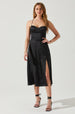 This satin dress features a sweetheart neckline that leads to a darted bustier-style bodice. Side slit accent. Open back features cross-straps.