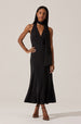 A woman is wearing a sleeveless black dress with a halter neck and an open back. The dress is fitted at the waist and flows down to a midi length. She is also wearing black high-heeled sandals with ankle straps.