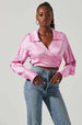The Loretta Top features a sleek satin finish. Pointed collar leads to a plunging V neckline. Wrapped front features a tie waist accent. Long sleeves with buttoned cuffs.