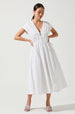 Summer days call for stylish dresses. The Lorrie Dress features a plunge neckline with ruching all throughout the bodice with drawstring details. Sleeveless design. Midi-length skirt with a front slit accent. V-cut back.