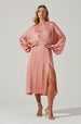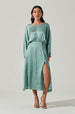 Love stories start here. This gorgeous satin-finish dress features a draped silhouette with long dolman sleeves, gathered front and cinched waist. Front slit accent punctuates a flowy and lined midi skirt. V-cut back. Concealed back zip closure.