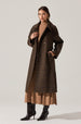 A woman is wearing a long, dark brown plaid coat with a belt at the waist and a wide collar. The coat has a classic checkered pattern and falls below the knees. Underneath, she is wearing a beige or tan pleated skirt that reaches mid-calf. She is also wearing tall black heeled boots. Her hair is dark brown, styled straight, and she is wearing gold earrings.