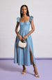 A woman is wearing a light blue maxi dress with textured fabric. The dress features ruffled cap sleeves, a fitted bust with seam details, and a high slit on the left side. She is also wearing nude strappy heels.