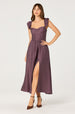 A woman is wearing a sleeveless, purple maxi dress with ruffled shoulder straps and a fitted bodice. The dress features a high slit on the side, revealing her leg. She is also wearing brown high-heeled sandals.