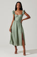 A woman is wearing a light green midi dress with a textured fabric. The dress has ruffled cap sleeves and a fitted bodice with visible seam details. It features a high slit on the left side, revealing her leg. She is also wearing clear high-heeled sandals and minimal jewelry.
